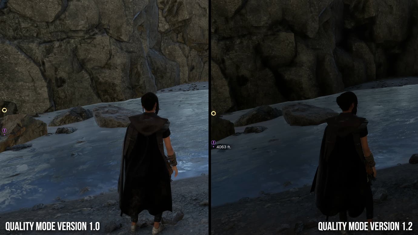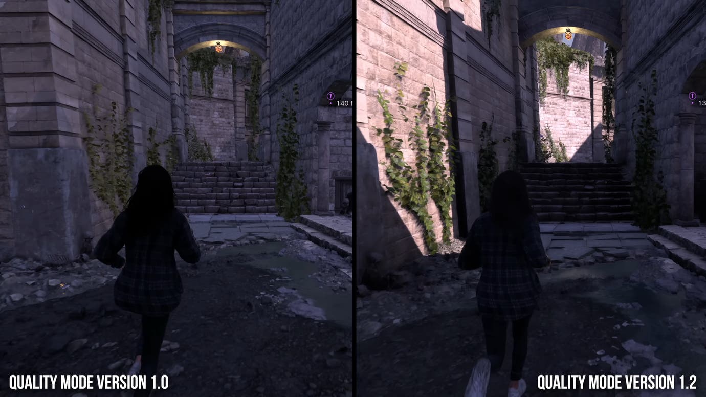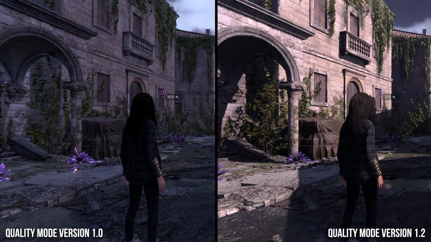Co ciekawe, porównując schemat dynamicznej rozdzielczości gry między 1,0 a 1,2, zauważyłem, że nowszy kod często zwracał wewnętrzną rozdzielczość wyższą niż 1,0 w trybach jakości i wydajności 60 Hz, pomimo poprawy wydajności – prawdopodobnie z powodu zmian w oświetleniu gry i mgle w najnowszych wersja.