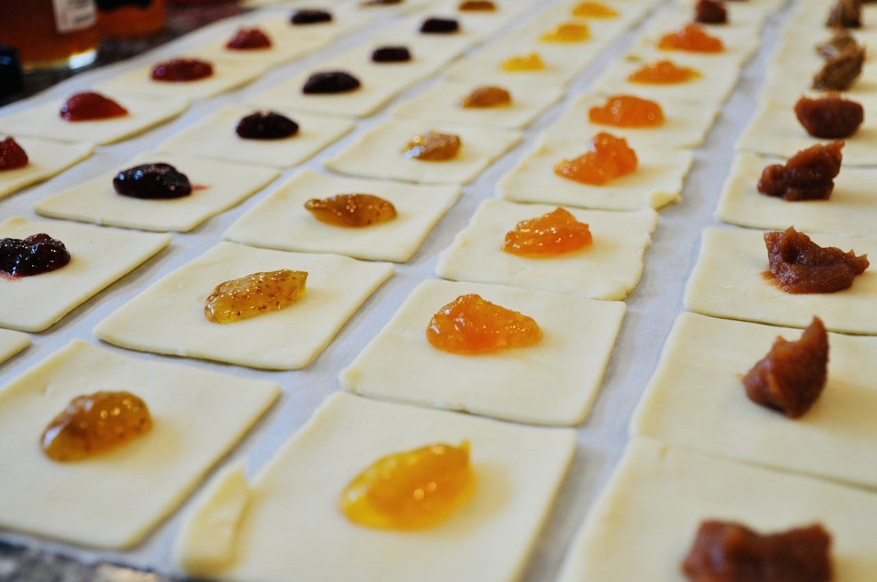 Największą trudnością przy robieniu kolaczków jest nadzienie. Jeśli nie dostaniesz odpowiedniej ilości, masz za dużo, rzeczywista patelnia opadnie. Następnie zeskrobujesz całą galaretkę i jest krucha; kolaczki się łamią. Trzeba włożyć tyle, żeby posmakować i zobaczyć, bo kolory mają znaczenie.